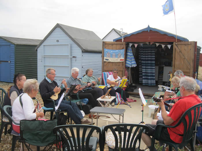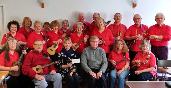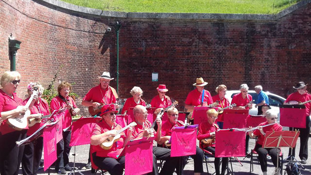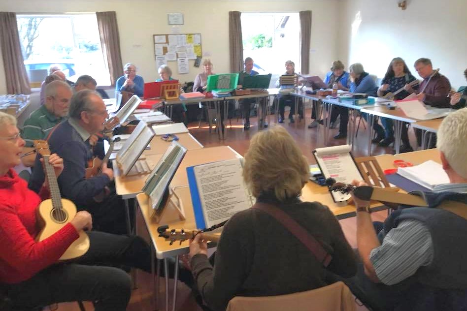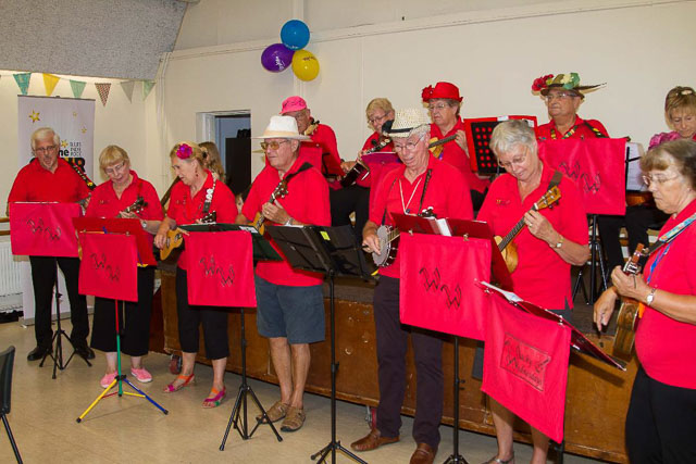 Since those ‘heady days’ the band has grown in strength and ability and currently has a membership of 23 ukulele players, with a couple of banjuleles available to provide appropriate music style when needed; if you play a ukulele you can also play a 4-string banjo, sometimes referred to as a ‘banjulele’, because tuning is identical.