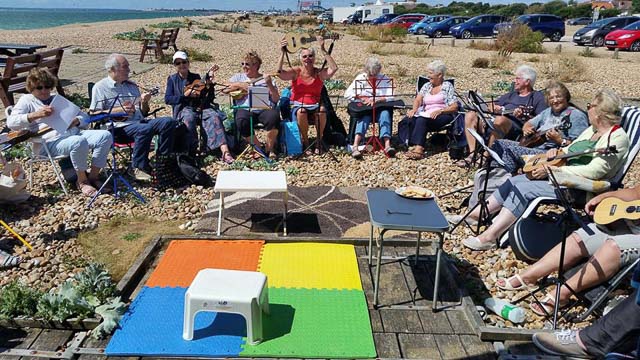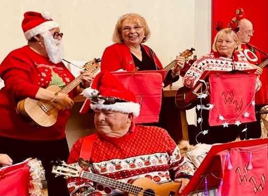 We remained undaunted during the Covid Pandemic and met every Wednesday forenoon on Zoom. With the Government's eventual modifying of the Covid restrictions we returned to normality and resumed practice sessions every Thursday afternoon at Lovedean Village Hall from 2-4 PM. Bookings also returned with 23 during 2022. 2023-2025 were a little quieter with an average of 12 bookings. With many ukulele bands now in the area competition for concerts is stiff.